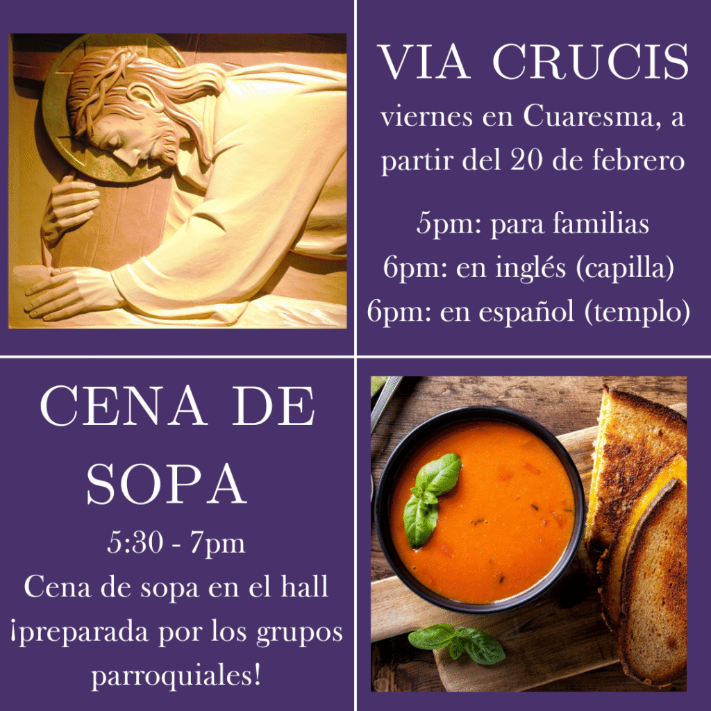 - Via Crucis para adultos: 6pm (en el Templo, español) y 6pm (en la capilla, en inglés)